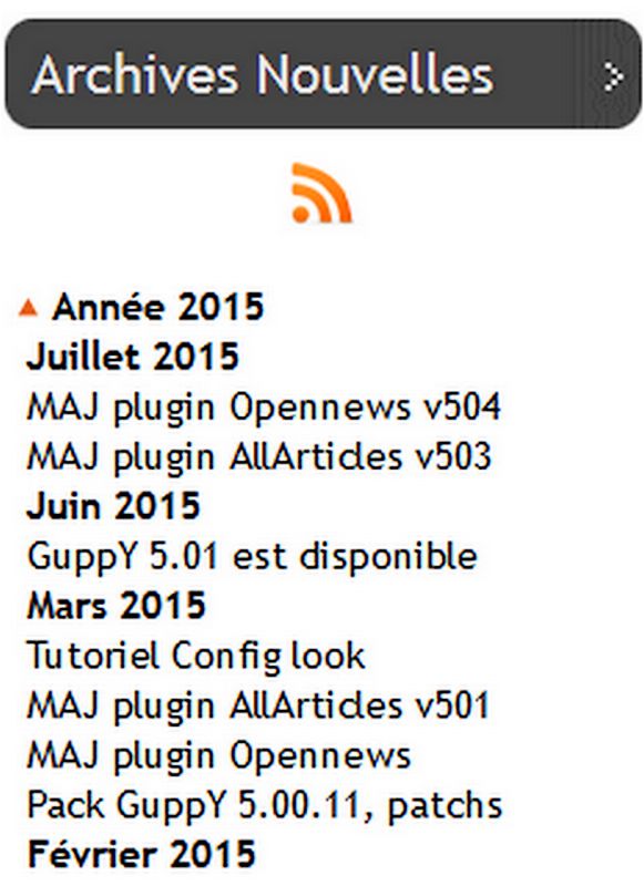 Ce plugin créé par OpenGuppY permet d'afficher dans une boite latérale les nouvelles de votre site, triées par année et par mois, en français et en anglais.