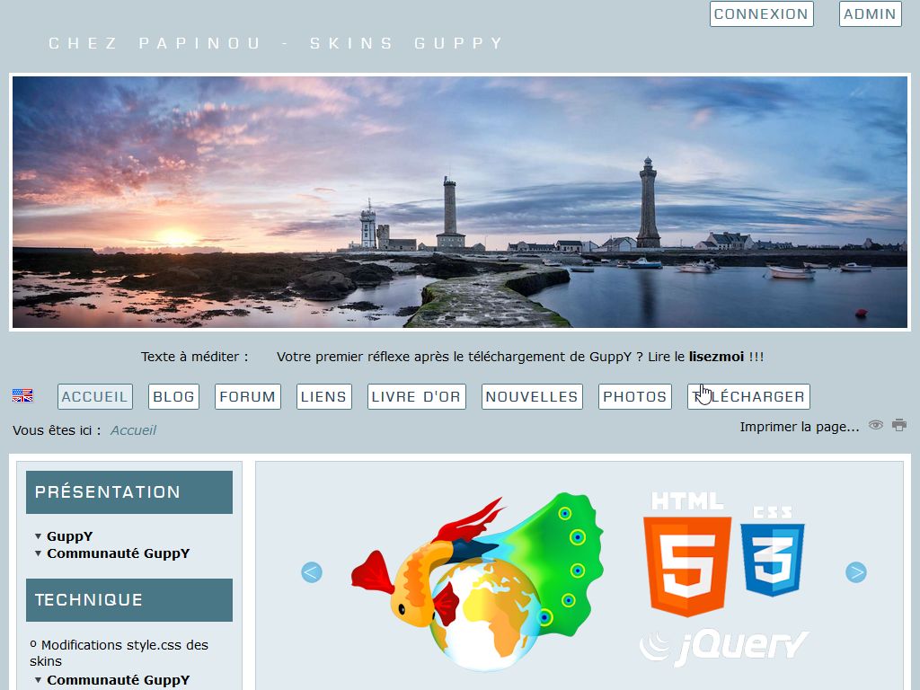 Télécharger la skin6-papinou-06 pour GuppY 6.00.xx, skin avec des boites latérales sur le coté gauche, des boites sont possibles à droite et la largeur est modifiable dans config look.