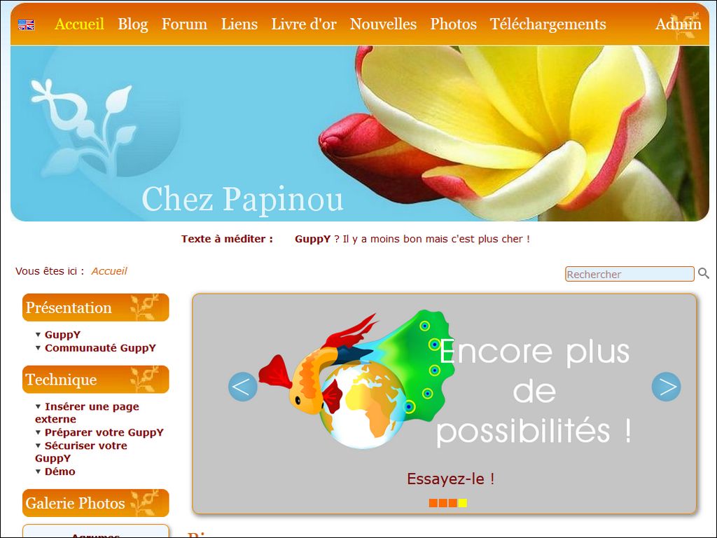 Télécharger la skn5_papinou 06 pour GuppY 5.0.x, skin avec des boites latérales sur le coté gauche , et une largeur de 1024px. C'est une adaptation de la skin Papinou 71 pour GuppY 4.6 .