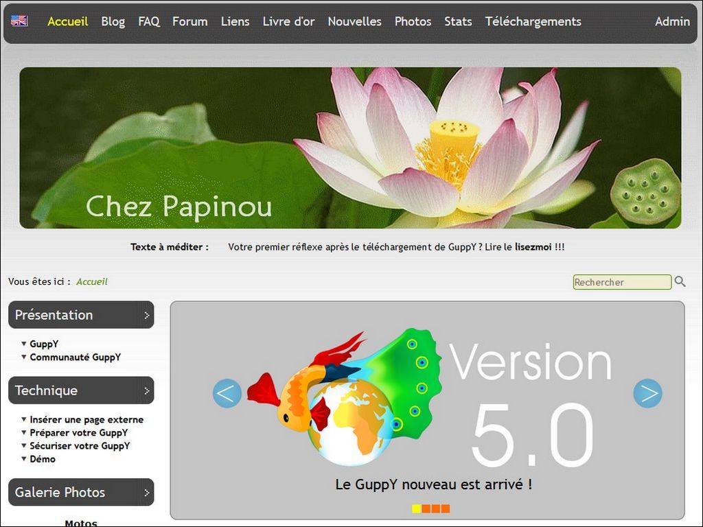 Télécharger la skn5_papinou 05 pour GuppY 5.0.x, skin avec des boites latérales sur le coté gauche , et une largeur de 1024px. C'est une adaptation de la skin Papinou 73 pour GuppY 4.6 .
